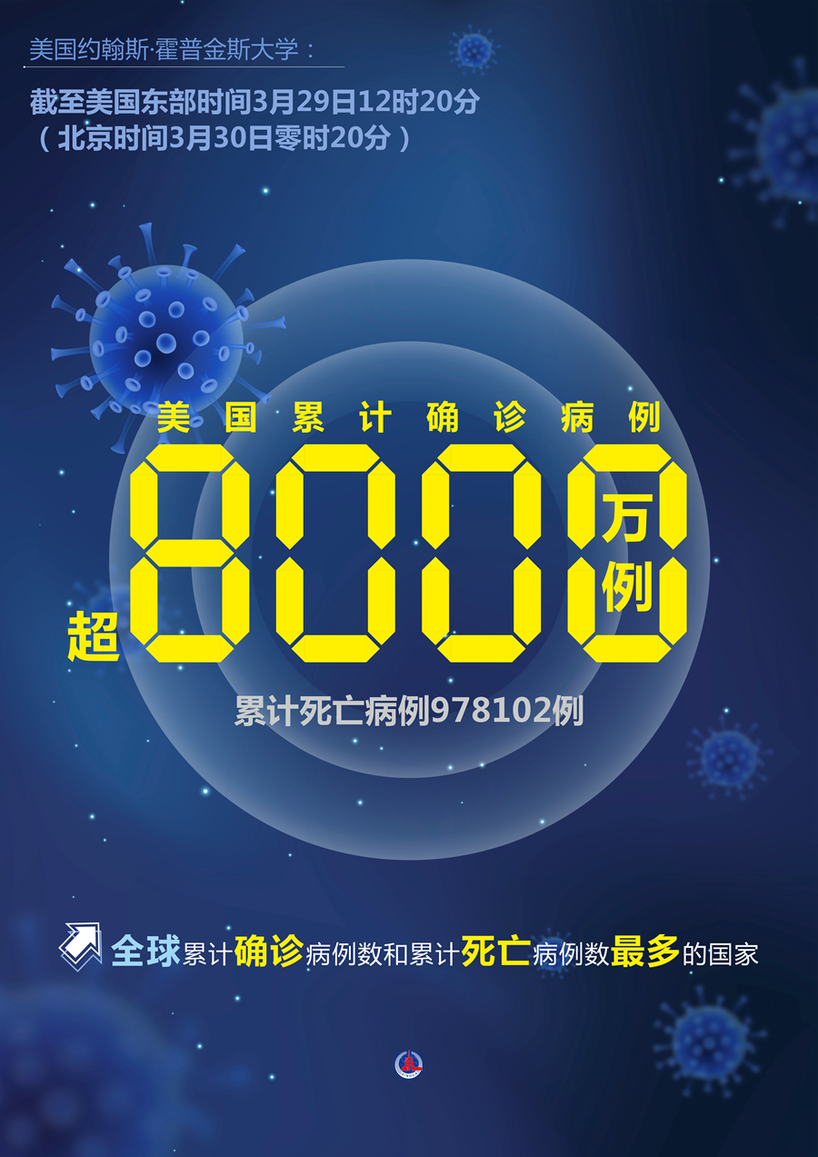 紐約3月29日電 美國約翰斯·霍普金斯大學(xué)29日發(fā)布的新冠疫情最新統(tǒng)計(jì)數(shù)據(jù)顯示,美國累計(jì)確診病例超過8000萬例。